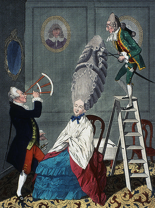 Эпоха королей и дворцов в Европе запомнилась потомкам не только пышностью интерьеров и соборов, но и различными изощренностями модниц. На головах дам XVIII века, выходивших в свет, красовались конструкции, которые порой впечатляли не меньше, чем ансамбль Версаля. Однако пышные высокие прически были в то же время и испытанием для европейских девушек. Давайте поподробнее разберемся, что выпадало на долю модниц XVIII века. Историческая справка Некоторые источники связывают появление полутораметровых причесок с кораблями и мельницами с графиней Дюбарри, фавориткой короля Людовика XV. Однако ей не уступала королева Франции Мария-Антуанетта. Шедевры, создаваемые придворным парикмахером, вынуждали монархов ездить в каретах без верха и избирать маршруты без низких арок, так как высокая прическа в них просто не прошла бы. Со временем парикмахерское искусство развивалось, а спрос на него все рос. Начинали открываться специальные академии, а прически становились все более популярны. Но вместе с у