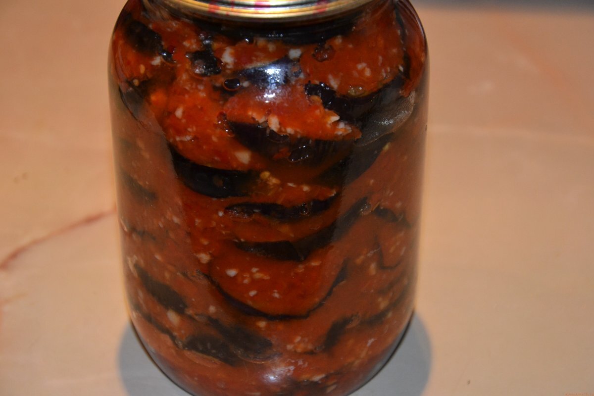 Приготовление заготовки на зиму (3 часа 30 мин): Первое: Сорт баклажанов для данной закуски из баклажанов на зиму не имеет значения. Окраска кожицы может быть любой - синей, фиолетовой и даже зеленой. Стоит учесть и возраст овоща. Это должны быть не переспевшие баклажаны, упругие и не порченные. Нарежьте хорошо вымытые баклажаны кружками толщиной 0,7-1 см. Это важно! Если нарезать слишком тонко, то при обжаривании кожица отделиться от мякоти. Но даже если при жарке такие тоненькие кружочки не распались, то достать их из банки целыми точно не получится. Поэтому, пусть будут кружки потолще, так вы точно сохраните их целостность. Солить баклажаны перед обжариванием с целью устранения горечи не нужно. Закуска в результате будет острой, и легкая горчинка баклажанов будет совершенно не ощутима.