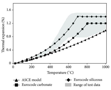 Бетон обычно подвергается расширению при повышенных температурах. Рисунок иллюстрирует изменение теплового расширения в НБК в зависимости от температуры, где заштрихованная часть указывает диапазон данных испытаний, представленных различными исследователями.