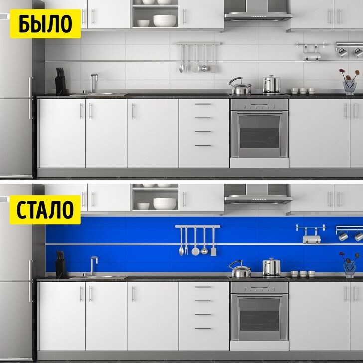 - Если вам хочется освежить кухню, достаточно просто поменять настенный фартук и подобрать ему под цвет парочку стильных аксессуаров. Так вы получите кардинальное изменение дизайна при минимуме затрат (например, как на картинке сверху).