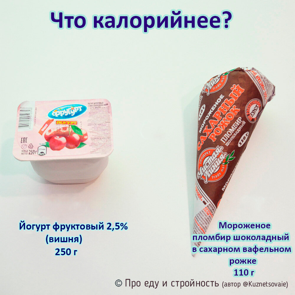 Ну а легкий фруктовый йогурт с жирностью 2,5% будет примерно на равне по калорийности с мороженым (жир 10,3).
