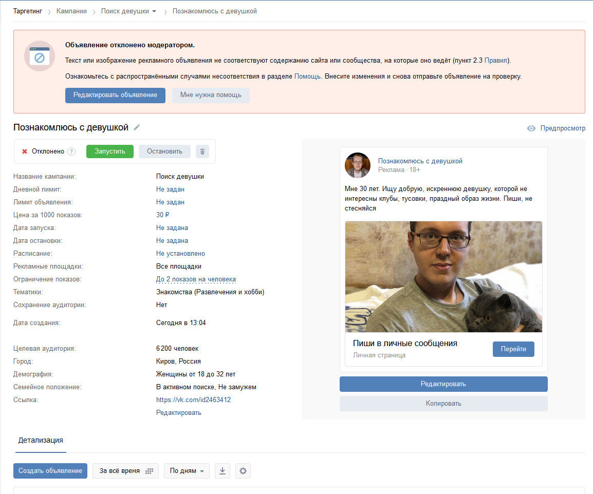 Сайты знакомств и приложения вроде Tinder, Badoo и подобных меня не привлекают, потому что в них нет возможности выбирать по понятным критериям, с кем бы ты хотел пообщаться. Как говорят IT-сфере: нет достаточных возможностей таргетинга и фильтрации целевой аудитории. Решил подойти к процессу знакомства нестандартно. А почему бы не разместить рекламу ВКонтакте с таргетингом на незамужних девушек моего города? Что ж настраиваю рекламное объявление, добавляю картинки и отправляю на модерацию. Однако здесь все начинают идти не по плану. Рекламное объявление было отклонено.
