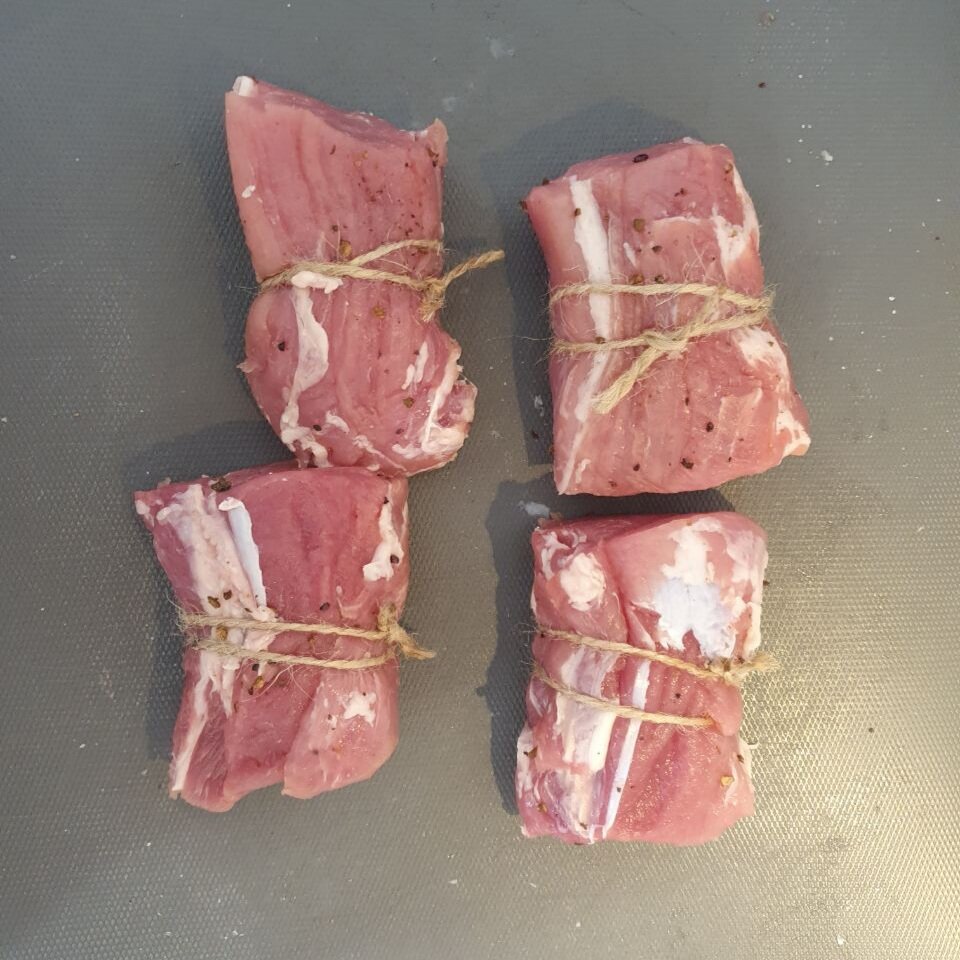 1. Нарезать вырезку на куски, каждый из которых по 150-200 грамм, посолить и поперчить. Связать ниткой или жгутом по середине для того, чтобы кусочки не потеряли свою форму и сохранили сочность