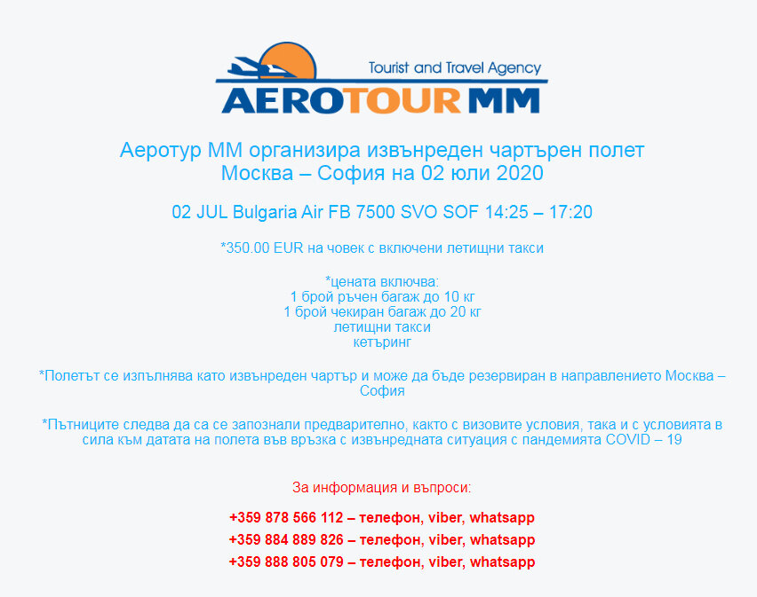 Туристическое агентство "Аеротур ММ" (София, Болгария) совместно с МИД Болгарии организует вывозной чартерный рейс Москва – София. Рейс согласован и состоится 02 июля 2020 г. Терминал F аэропорта Шереметьево