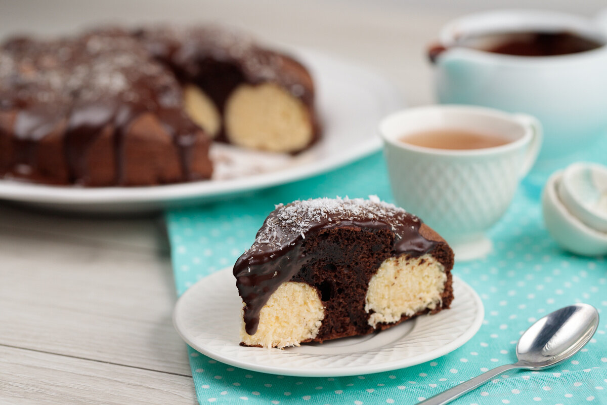 Три разных текстуры, три разных вкуса контрастируют, но при этом гармонично дополняют друг друга. Шоколадный бисквит, творожно-кокосовая начинка и мягкая шоколадная глазурь – это сочетание не терпит критики.