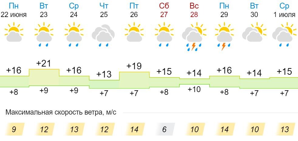 Ночные температуры ожидаются еще более низкими – от +7°C до +10°C. Причем самой теплой окажется ночь с 28 на 29 июня. На эти же дни синоптики прогнозируют грозы с усилением ветра до 14 м/с.
