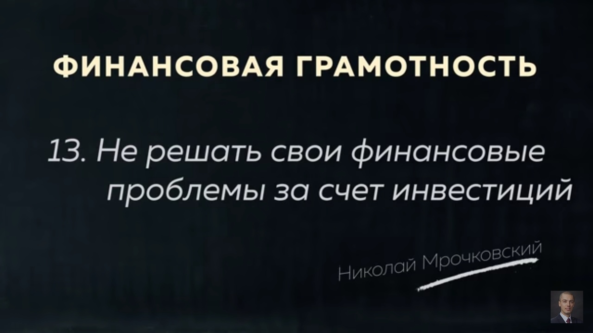 Друзья, приветсвую! С вами, Николая Мрочковский. Продолжаем тему финансовой грамотности Если вы оказались в яме! Если оказалось так, что у вас финансовые трудности и проблемы, то я крайне не рекомендую пытаться это решить за счёт того, что ВЫ наберёте ещё кредитов! Либо за счёт того, что вы будете вкладывать деньги в какие-либо высокорискованные истории. У меня есть примеры, когда люди пытались спасать бизнес, вкладывая деньги в крайне рискованные инвестиции. Например, в торговлю на FOREX! Я знаю такую историю, когда человек принёс кучу денег, замечу, что это были его ПОСЛЕДНИИ деньги! Он вытащил их все и вложил их на FOREX, рассчитывая, что выиграет и спасёт свой бизнес. ЭТО ГЛУПОСТЬ! Ни в коем случае так поступать нельзя. Т.е. не решать текущие проблемы с помощью инвестиций и кредитования. Если ТЫ загнал себя в яму, перестань копать! Начни разбираться с текущей ситуацией. Да, это может быть сложно, больно, но ты как минимум не начнёшь себя закапывать ещё глубже. Это тот принцип, к