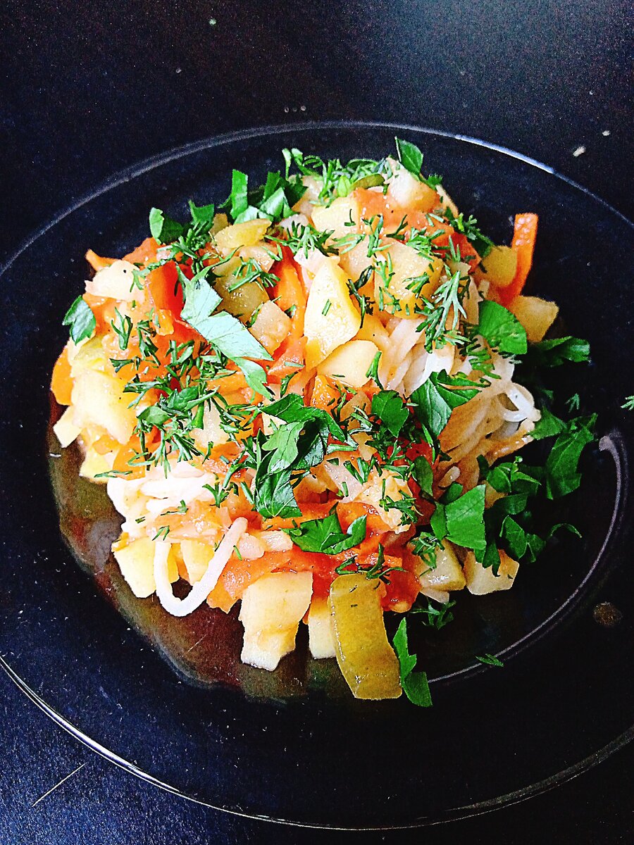🔸Ингредиенты: Морковь 🥕 - 1 шт. Картошка 🥔 - 3 шт. Кабачок - 1 шт. Лук - 1 шт. Сладкий перец - 1 шт. Помидоры 🍅 - 2 шт. Оливковое масло Зелень 🌿 Кетчуп Соль 🔸Способ приготовления: Чистим все овощи и нарезаем. Сперва обжариваем морковь на оливковом масле. Затем закидываем картошечку и обжариваем ещё минут 10. Отдельно обжариваем кабачок, лук и перец минут 5, закрыть крышкой и потомить ещё минут 5-8. Теперь смешиваем обжаренные овощи, добавляем немного кетчупа и перемешиваем. Оставляем томиться минут на 10-15. Когда будет почти готово солим по вкусу, перемешиваем и сверху выкладываем помидорки. Готовим ещё минут 10. Перед подачей посыпаем зеленью. #овощноерагу #овощноерагу #вкуснопросто #быстрыерецепты #готовимдома