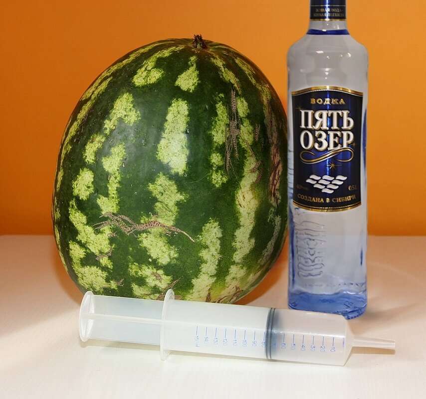 Если вы открыли эту статью, то есть два предположения: 1)вы захотели чего-то новенького; 2)вам совсем нечем заняться). Как бы то ни было, кем бы вы ни были, мы все равно поделимся рецептом: как сделать арбуз с водкой. Да, кстати, вы можете использовать вместо водки и другой алкогольный напиток, но водка – это же классика. Итак, сначала приготовим все необходимое: Как готовить: Налейте водку в стакан, наберите ее в шприц (чисто удобства ради) Спицей проткните арбуз возле хвостика. Отверстие должно вести точно в пустоту в центре арбуза. Можете, конечно, сделать больше отверстий, но есть риск, что водка будет выходить обратно через одно из них. Поэтому мы советуем обойтись одним проколом, постепенно вливать водку через него, периодически выпуская накопившийся в арбузе воздух После того, как вы «накачаете» арбуз, замажьте дырку (дырки, если вы не последовали нашему совету), например, пластилином Затем просто оставляем арбуз не менее, чем на 8 часов в холодном месте. За меньшее время он п