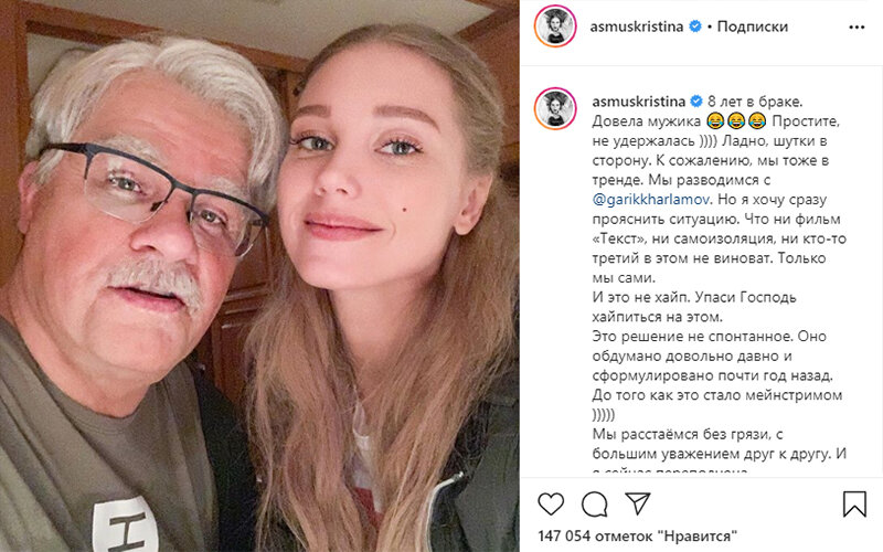 После 8 лет брака Кристина Асмус и Гарик Харламов объявили о разводе в своих микроблогах в Instagram. Каждый из них написал трогательную речь и воздержался от каких-либо дополнительных комментариев. Но что же пошло не так в звездной семье и могло стать причиной разлада? Как написала Кристина Асмус, решение о разводе было принято еще год назад. Как раз на этот период приходятся первые журналистские слухи о том, что в их семье не все гладко. Этому поспособствовали и сами актеры, которых практически не видели вместе. Даже в инстаграме они перестали выкладывать совместные снимки. Кристина по большей части демонстрировала свои, порой излишне откровенные, фото, а Гарик в основном использовал свой микроблог, чтобы делиться с подписчиками смешными картинками. В феврале 2019 слухи о изменах Асмус достигли своего пика и Гарику пришлось сделать заявление, что в его семье все в порядке. "Не ведитесь и не присылайте мне это. Все хорошо. Жена рядом, дочь — моя. Больше писать о них не буду. Всем доб