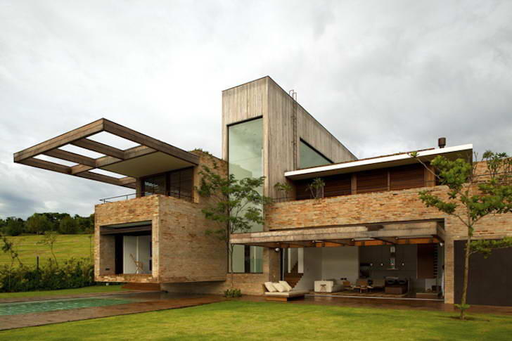 Этот экологичный и эффектный дом из кирпича, дерева и стекла, практически не видимый со стороны входа, построен на склоне у поля для гольфа недалеко от Сан-Паулу.