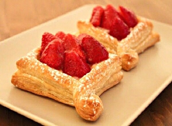 Слойки с клубникой и заварным кремом, испеченные из слоеного теста – можно готовить не только с летними ягодами. Вы можете приготовить сладкое лакомство, начинив его вареньем, медом с орехами, фруктами, ягодами, кремом или сгущенкой. А можете испечь соленые слойки и использовать в качестве начинки овощи, рыбу или мясо. Форма слоек может быть тоже самой разной, начиная от простых квадратов (как нарезанный торт Наполеон), заканчивая фигурными плетеными корзинками или конвертами. Вообще слоеное тесто уникально по своим качествам: оно легкое в приготовлении, долго храниться в холодильнике, а количество блюд, которые можно из него приготовить, просто бесчисленное. В нашем рецепте мы предлагаем использовать уже готовое слоеное тесто (покупное или приготовленное по особому рецепту, который вы можете прочесть здесь). В качестве начинки для пирожных из слоеного теста мы выбрали легкий молочный заварной крем и ягоды клубники. С виду пирожные напоминают корзинки или лодочки, внутри которых аккура