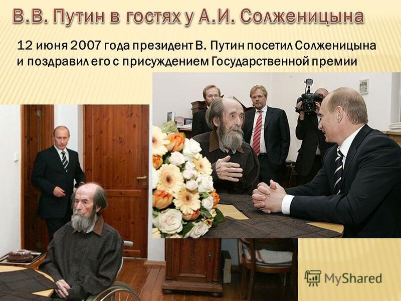 Так, в июне 2007 года в Кремлёвском дворце состоялось вручение государственных наград. После церемонии вручения президент России Владимир Владимирович Путин нанёс визит Солженицыну домой.