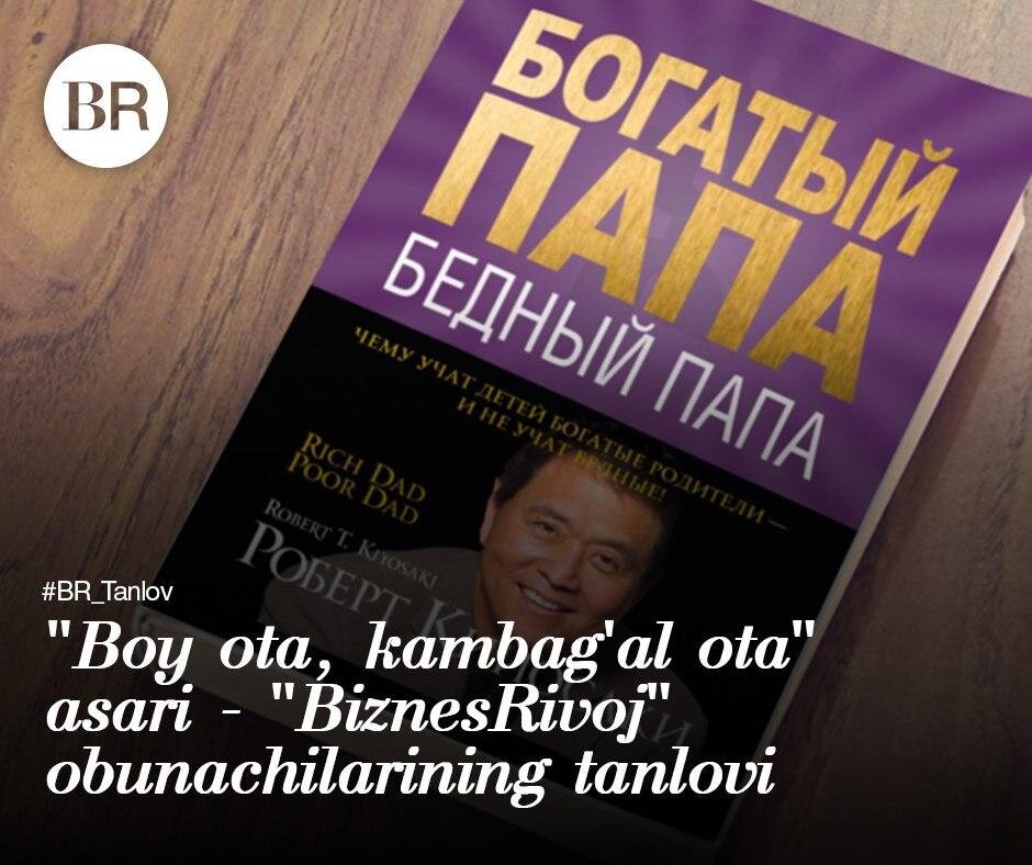 "BiznesRivoj" onlayn jurnali tomonidan "Sizning hayotingiz, dunyoqarashingiz va qadriyatlaringizni o'zgartira olgan kitob qaysi?" deya berilgan savolga obunachilarimizning katta qismi Robert Kiyosakining "Boy ota, kambag'al ota" nomli asarini belgiladilar.