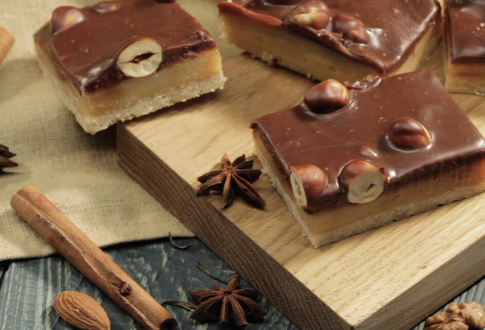 Ингредиенты Шоколад молочный 180 гр Сахар 8 ст.л Масло сливочное 120 гр Масло сливочное 50 гр Сгущёное молоко 400 гр Фундук 40 гр Мука 1 ст. Приготовление 1.Готовим тесто: муку смешать с размягченным при комнатной температуре маслом и 4 ст.л. сахара. 2.Выложить тесто в смазанную маслом форму для выпечки и поставить в разогретую до 180 градусов духовку на 15-20 минут. 3.Готовим нугу: сливочное масло растопить на сковороде. 4.Добавить сахар (количество по вкусу), перемешать и прогреть до растворения. 5.Влить сгущенку и варить до загустения (5-8 минут). 6.Выложить сгущенку на корж равномерно и убрать в холод на 30 минут. 7.Готовим глазурь: растопить шоколад на водяной бане, смешать с орехами. 8.Выложить на слой застывшей сгущенки. 9.Убрать печенье в холод на 2 часа. Подавать, разрезав на небольшие кусочки. ПРИЯТНОГО АППЕТИТА