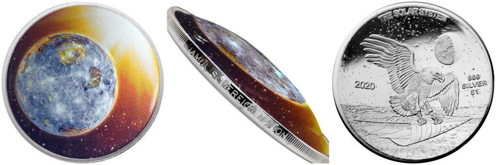 Недавно была представлена вторая монета из серии американских монет «Солнечная система». Она выпущена компанией Native American Mint и посвящается планете Меркурий. Как интересный момент стоит от метить тот факт, что монета имеет куполообразную форму. Дизайн ее выпуклого аверса основан на цветном и детальном изображении планеты Меркурий. Напомним, что Меркурий является первой планетой от нашего центрального светила и имеет самую узкую орбиту вокруг него. Его расстояние до Солнца составляет всего около трети расстояния от Солнца до Земли. Это также самая маленькая планета в нашей системе. На реверсе указана надпись «SOLAR SYSTEM», характеристики драгоценного металла, год выпуска и изображение Американского орла. Монета номиналом в 1 доллар США и массой в одну унцию (33,1 грамма) изготовлена из серебра 999-й пробы в качестве «пруф». Она поставляется на рынок в специальной капсуле. Оригинальная коллекционная коробка для всех девяти монет серии включена в стоимость покупки первой монеты