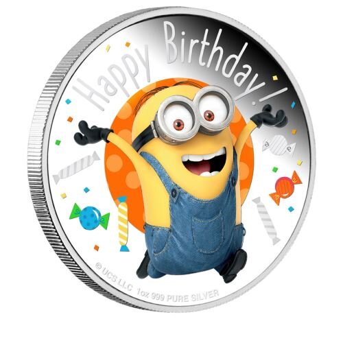 Фанаты были влюблены в безумных помощников ГРУ, ярко-желтых миньонов, с тех пор как Гадкий я украсил экраны в 2010 году. Восхитительная история преображения злого ГРУ от рук трех девочек-сирот стала еще более трогательной из-за их комических междометий. Независимо от того, дразнили ли Миньоны друг друга, смеялись ли над детскими шутками, помогали ли исправившемуся злодею развлекать детей или выполняли тайные миссии в возмутительных масках, эти уникальные помощники захватывали сердца по всему миру. Озорной Дизайн На реверсе монеты изображено цветное изображение веселого миньона Марка, празднующего в окружении конфетти и сладостей. Надпись " С Днем Рождения!’ это тоже входит в дизайн.