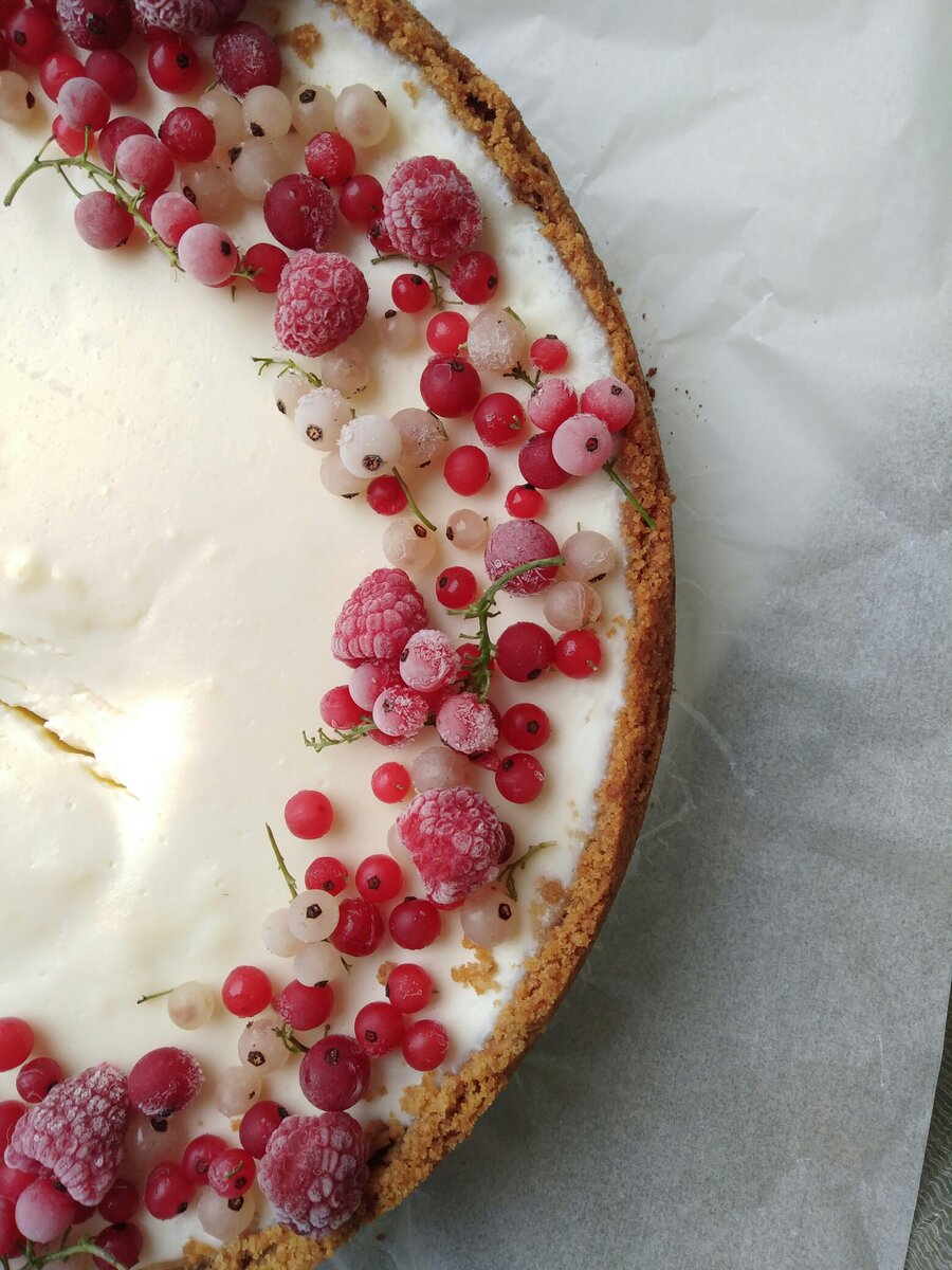 Нам понадобится: Печенье (топленое молоко, Юбилейное и тд) - 400 г Сливочное масло - 150 г Творог (или сливочный сыр) - 800 г Сливки (20% жирности) - 120 г Сахар - 200 г Яйцо куриное - 3 шт Сметана (20% жирности) - 250 г Любимые ягоды (для украшения) по желанию Данное количество ингредиентов рассчитано на разъемную форму 23 см. 1. Печенье измельчи в крошку, а сливочное масло растопи. Застили дно формы пергаментной бумагой. Совет: не обрезай края бумаги, тогда будет легче переместить готовый чизкейк на блюдо для подачи. 2. Соедини масло с печеньем и тщательно перемешай. Утрамбуй печенье с маслом в разъемной форме и отправь основу для чизкейка в холодильник. Включи духовку на 170 градусов. Приготовим самое вкусное - начинку 3. Если используешь творог, то перетри через блендер в однородную, кремовую текстуру. Совет: творог не должен быть зернистым. 4. Добавь сливки и снова перетри блендером до приобретения нежной текстуры. Добавь в полученную массу 3 яйца, 200 гр. сахара и снова
