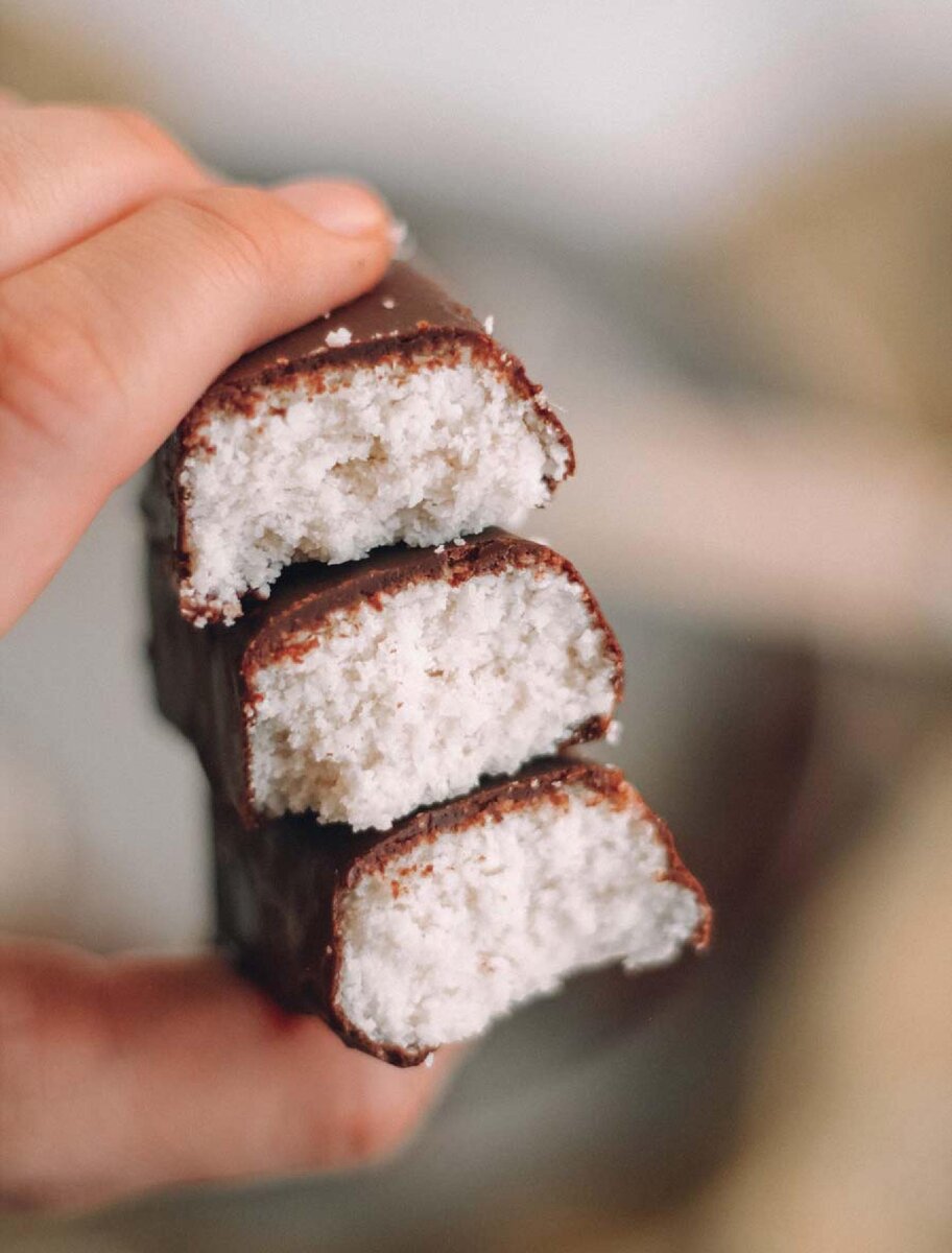 Bounty изготовляют с 1951 года. А вот в не далеком 2007 эта кокосовая радость исчезла с Российских прилавков на целых 4 года! Во избежание повторения этих горьких лет предлагаю рецепт таких же вкусных, домашних батончиков. Ингредиенты: 100 гр. сливочного масла 70 гр. сахара 70 гр. молока 100-170 гр. кокосовой стружки Щепотка соли Для глазури: 150 гр. шоколада 30 гр. растительного масла без запаха 1. В небольшой кастрюле смешиваем молоко, сахар и сливочное масло. Его можно порезать на кусочки, чтобы растопить быстрее. Ставим смесь на средний огонь и помешиваем, пока масло не растворится. 2. Снимаем с плиты и всыпаем кокосовую стружку. Тщательно перемешиваем. Стружка быстро впитывает жидкость и набухает. Должна получиться плотная густая консистенция. 3. Берем небольшой противень, покрываем пергаментом и выкладываем получившуюся массу, очень плотно ее прижимая. Слой должен получиться не меньше полутора сантиметров. 4. Оставляем остыть до комнатной температуры и отправляем в хо