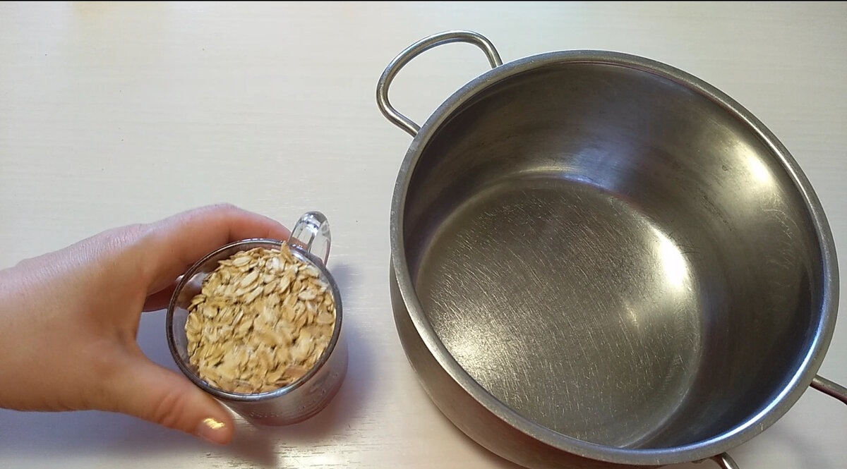 В кастрюлю насыпаем 1 стакан овсяных хлопьев «Геркулес» длительной варки, у меня стакан объёмом 250 мл.