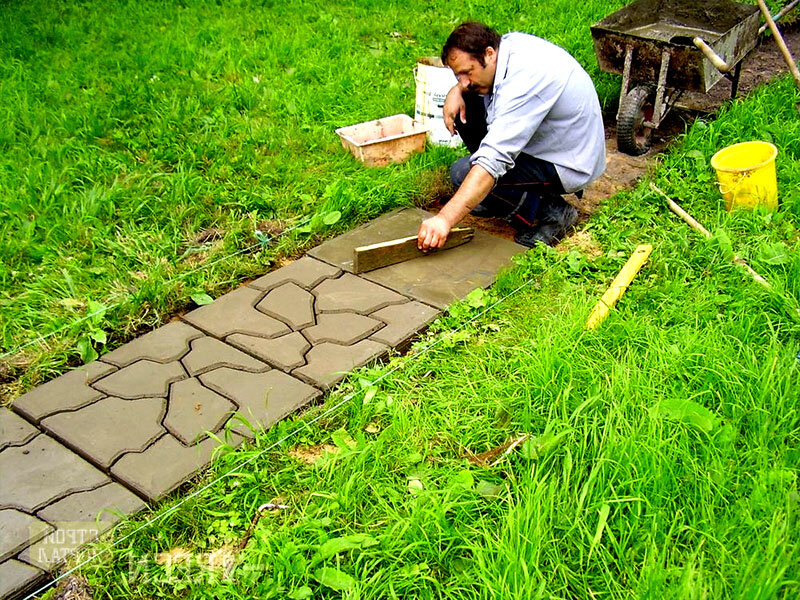 Для выкладывания мощенной дорожки нужно подготовить песчаное основание толщиной около 8 сантиметров. Расстояние между плитками засыпать почвой с семенами газонной тр