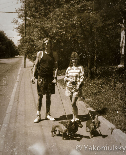 **Дневник барабанщика** стр 18 А это непосредственно те самые таксы, которые лаяли в «Хару Мамбуру». Они вдвоём на шлейке. Третью таксу не помню. Видимо попросили взять на время. А девушку зовут Элла. Она сыграла большую роль в моей жизни и в жизни группы. Это было начало 90х. Всё рухнуло, было непонятно как жить, а музыкой заниматься хотелось. Мы очень хотели записать новые песни, денег на студию не было. Вот мы и решили искать спонсора. Мы с Эллой брали газеты и просто обзванивали рекламные объявления, предлагая проспонсировать никому неизвестную группу. Именно Элла нашла фирму «Лукьянов и брат», которые дали нам деньги на запись альбома «Хару Мамбуру». 120 тыс рублей. По те временам очень большие деньги. Потом Элла нашла ещё спосноров, фирму «М-ком», они дали нам 10 тыс долл. На мою жизнь она тоже повлияла сильно, научив меня очень многому. Вскоре мы взяли себе щенка ротвейлера и назвали её Хара. Вообще, в жизни «Ногу свело!» было много людей, сделавших конкретные действия, в резул