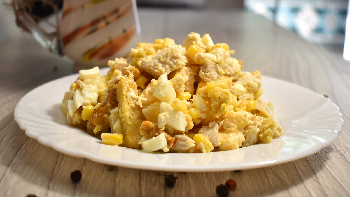 Салат с ананасами, куриным филе и сухариками (все ингредиенты хорошо сочетаются)