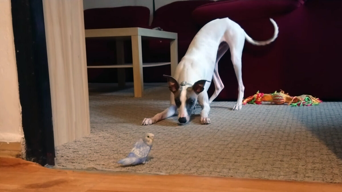 Рассказ прислан нашим читателем в рамках седьмого сезона акции «Заработай на своей истории о птицах». С 1 по 30 июня 2020 г. бонус составит 3000 рублей. Ссылку на условия акции вы найдете внизу страницы. Сколько себя помню, у нас всегда были животные, птицы или рыбки. Одно время жили хомячки, хорошо, что сбежали. Часто наши животные дружили между собой, иногда – нет. Эта история случилась, когда у нас дома уже несколько лет жила собака породы уиппет. Других животных в доме не было, поэтому всё наше внимание было приковано к ней. И она, похоже, тоже была этому рада – наслаждалась всеми плюсами единственного и любимого животного. Однажды, наш знакомый, который разводил птиц, принёс нам волнистого попугайчика. - Приютите на время, а то мои птицы расплодились, а рассадить некуда. Этот вот – шустрый и задиристый очень, с другими вместе не посадишь. Так у нас появился попугай. Дело было вечером, поэтому постоянное место для клетки мы подготовить не успели, поставили всё на кухонный стол, по