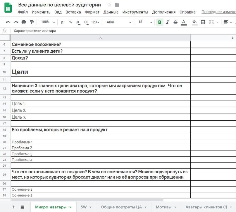 Я выслал клиенту заранее подготовленный документ, для анализа Целевой аудитории.