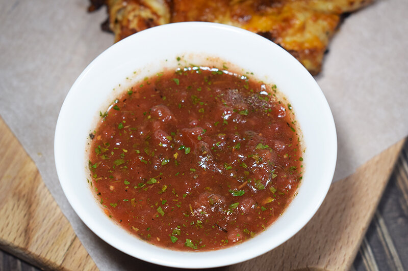 Примерное КБЖУ на 100 грамм: 74,7 ккал; Б - 0,6 г; Ж - 4 г; У - 9,3 г. Ингредиенты: - сочный томат - 1 шт; - томатное пюре - 2 ч ложки; - сахарный песок - 1 ч ложка; - соль - 1 - 2 щепотки; - растительное масло - 6 мл; - свежие или сушеные базилик и петрушка по вкусу. Способ приготовления: Подготавливаем томат Томат хорошо промываем и подсушиваем бумажным полотенцем. Теперь нам нужно сделать томатное пюре, для этого разрезаем томат на 2 части и натираем его на тёрке (кожуру выкидываем, в соусе нужна только мякоть). Стабилизируем пюре Чтобы соус был однородным и не расслаивался его необходимо стабилизировать. Это можно сделать с помощью покупного пюре/соуса. Добавляем к томатной мякоти несколько ложек покупного томатного пюре или соуса и хорошо перемешиваем. Добавляем специи К стабилизированному пюре добавляем соль, сахар, растительное масло, петрушку, базилик и хорошо перемешиваем. Даём соусу 4 - 6 минут настояться. Подаём к столу Перекладываем соус в креманку или соусник и подаём к мя