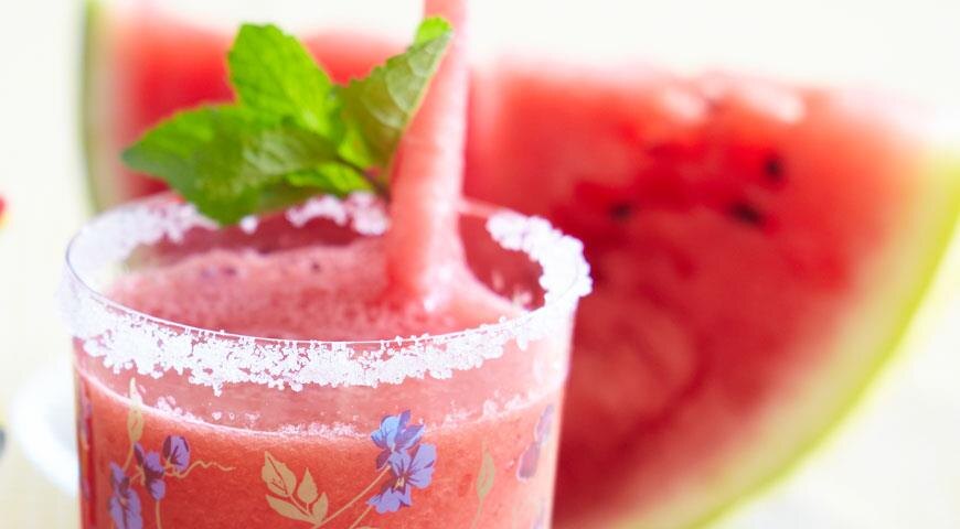 ИНГРЕДИЕНТЫ четверть среднего арбуза (примерно 700 г) 1 стакан осветленного яблочного сока 2 лайма 1 небольшой пучок мяты сахар, по возможности цветной ПОШАГОВЫЙ РЕЦЕПТ ПРИГОТОВЛЕНИЯ 1. У арбуза удалить корку, из мякоти удалить семечки. Отложить 1 лайм и 4–6 веточек мяты для украшения. У оставшейся мяты удалить веточки, листья нарезать. Выжать из оставшегося лайма сок. Взбить арбузную мякоть с яблочным соком, мятой и соком лайма до однородности. 2. Смочить края высоких стаканов в воде, окунуть горлышком вниз в насыпанный на блюдечко сахар. Очень аккуратно разлить по подготовленным стаканам арбузный мохито, украсить веточкой мяты и парой ломтиков лайма. Подать немедленно. 3. Алкоголь на ваше усмотрения. (ппссс . эй ты . да ты . это бомба вкуса.....)