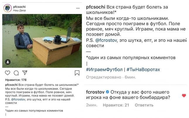 Хочу вот о чем написать. О скандале матча #фкростов -Сочи, думаю, знаю все. Даже те, кто к футболу до этого ближе чем на километр не подходил. Уж больно масштабная получилась феерия маразма. Конечно, обделаться так, как это сделал #фксочи не то что сложно, захочешь, в такую жопу не влезешь. Но я сейчас не об том. Не о матче, не о #РФС и #РПЛ, даже не о наших мальчишках. Все это писано переписано, говорено переговорено и без моих комментариев (хотя в обсуждениях, каюсь, пару раз не сдержалась и я)) Для меня пробивом сочинцами дна в плане репутационных потерь стала одна новость, которую тогда мало кто заметил. Обвинить невнимательных нельзя, новости лились потоком, одна акуительнее другой. Итак, по порядку. #фкРостов сообщает, что на матч поедут игроки Академии Ростова. #фксочи постит в инстаграмме офигительную по своей тупости и глумливости картинку, на которую #фкРостов весьма остроумно отвечает. И знаете, что делают сочинцы? Удаляют публикацию (не сразу, но да)? Извиняются (ну как из