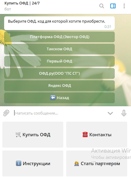 В телеграм боте можно купить ОФД 24\7 как по розничной, так и по оптовой цене. Суть в том что вы можете в любое время суток купить код ОФД, и бот автоматом пришлет вам его через 30 секунд после оплаты. Минимум ожидания!