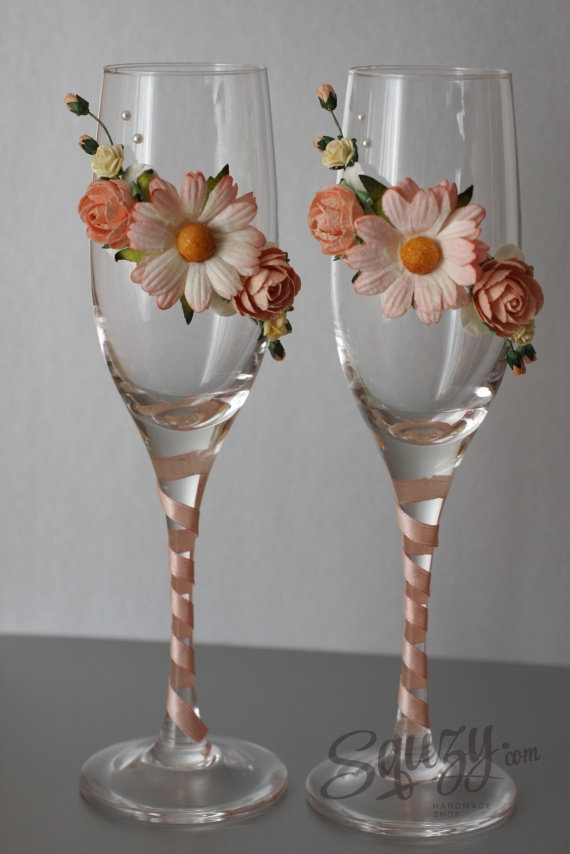В последнее время очень популярно оформлять свадьбу в каком-то определенном цвете, либо паре цветов, которые будут использоваться при оформлении зала, в элементах одежды жениха и невесты, приглашениях и фужерах. Сегодня мы сделаем фужеры в персиковых тонах. Материалы: узкая атласная лента персикового цвета, различные бумажные цветы персикового и белого цвета, клеевые полубусины, пара фужеров.