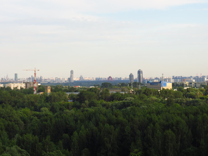 Теперь отсюда потрясающий обзор на разные объекты Москвы. Например - комплекс "Алые паруса" около Щукинской. А перед ним мы можем увидеть построенный к чемпионату мира стадион на Тушинском аэродроме рядом с недавно открывшейся станцией Спартак.