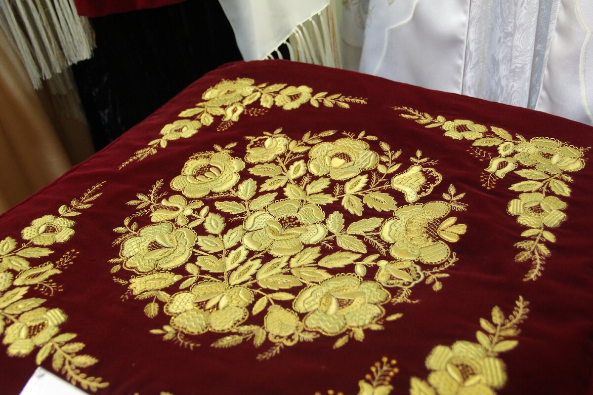 Конечно, это не единственная цветовая гамма. В музее фабрики можно встретить самые разные цветовые сочетания на самых разных изделиях – здесь представлены большие панно с изображениями городов, вышитые иконы, вымпела, знамена, воротники, сумочки, головные уборы. Нить может быть любого цвета, но каждая обязательно должна состоять из 8% золота и 92% латуни. Именно поэтому нить называют не золотой, а золотной.