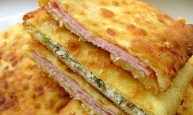 Ингредиенты: -Кефир — 1 стакан -Соль, сахар и сода — по 1/2 ч. л. -Натертый на терке твердый сыр — 1 стакан -Натертая на терке ветчина или сосиски (можно также использовать творог с зеленью) — 1 стакан -Мука — 2 стакана Приготовление: 1. Добавьте в кефир соль, сахар, соду. Хорошенько перемешайте. 2. Теперь надо накрошить сыр и добавить муку, а затем замесить тесто. 3. Скатайте из теста шар. Полученную массу разделите на 4-6 частей, раскатайте лепешки толщиной примерно по 2-3 мм и положите внутрь начинку. Соедините края лепешки и очень аккуратно раскатайте еще раз. 4. Разогрейте растительное масло на сковороде. Теперь нужно прожарить сырные лепешки с двух сторон на среднем огне, накрыв крышкой. 5. Когда появится золотистая корочка, снимите лепешки со сковороды и подайте на стол. Готово! Совет: Лучше всего подавать это блюдо горячим, вместе со сметаной. Такое угощение наверняка понравится всем! Приятного аппетита!