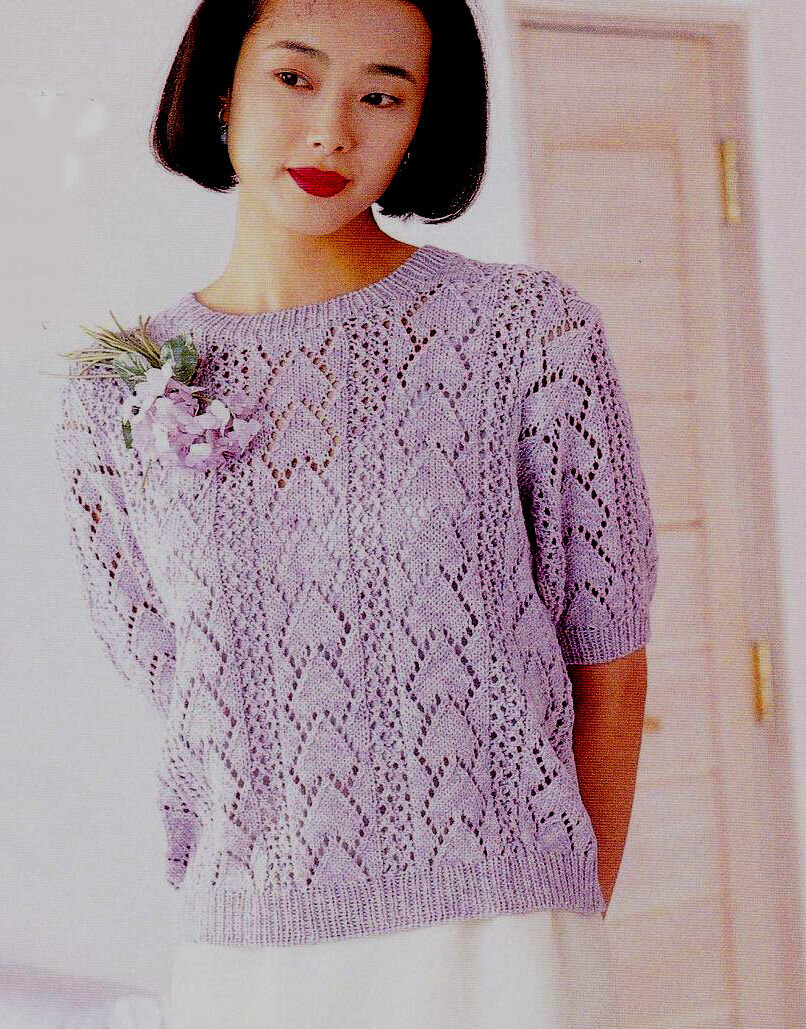 Нежная, сиреневая кофточка с простыми, но не смотря на это, очень эффектными узорами ромбы и разделяющими их ажурными полосочками.
