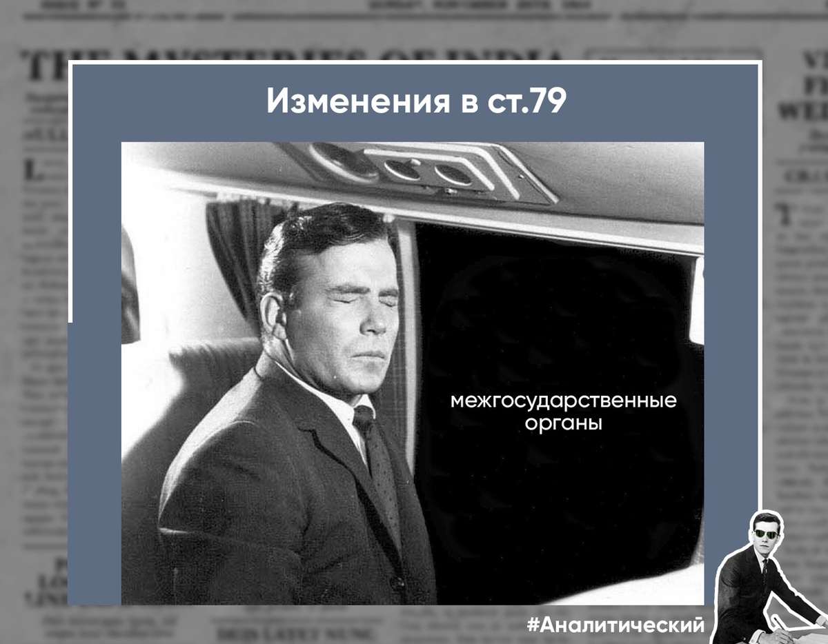 Действующая редакция ст. 79: «Российская Федерация может участвовать в межгосударственных объединениях и передавать им часть своих полномочий в соответствии с международными договорами Российской Федерации, если это не влечет за собой ограничения прав и свобод человека и гражданина и не противоречит основам конституционного строя Российской Федерации».
