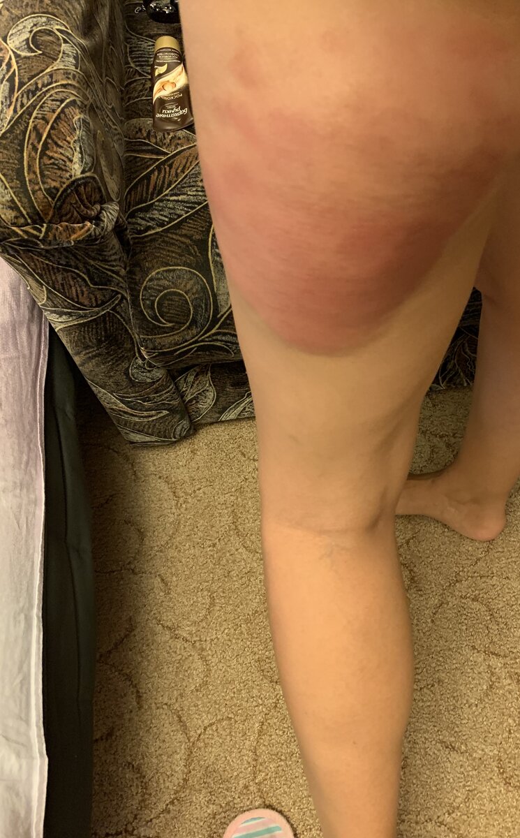 Спустя час я всё ещё была жива. Встала к кушетки и увидела в зеркале свои бока - кожа в районе «ушей» была покраснела и выглядела устрашающе. На тот момент я ещё не знала, что меня ожидает на следующий день... А пока вашему вниманию мои ляжки вечером этого же дня: