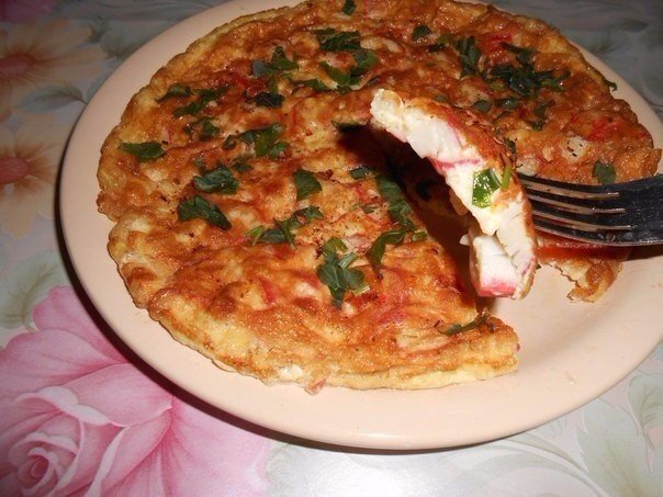 На 2 порции нам понадобится: 3 яйца; половина помидора; 5 крабовых палочек; 30 гр. сыра (Пошехонский,Российский все рано); масло растительное для жарки; соль перец по вкусу; зелень Приготовление: Яйца взбить венчиком,добавить порезанный мелким кубиком помидор,тонко порезанные крабовые палочки,тертый сыр,посолить и поперчить.Все хорошо перемешать.На хорошо разогретую сковороду с небольшим кол-м масла вылить наш омлет,закрыть крышкой и "выпекать" на медленном огне.Время около 5-7 минут.Готовый омлет посыпать любимой зеленью. Получается сытное,сочное и вкусное блюдо!