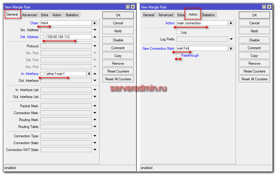 То же самое делаете для второго соединения, заменяя ip ардес, имя интерфейса и назначая другую метку. Должны получиться следующие 4 правила.