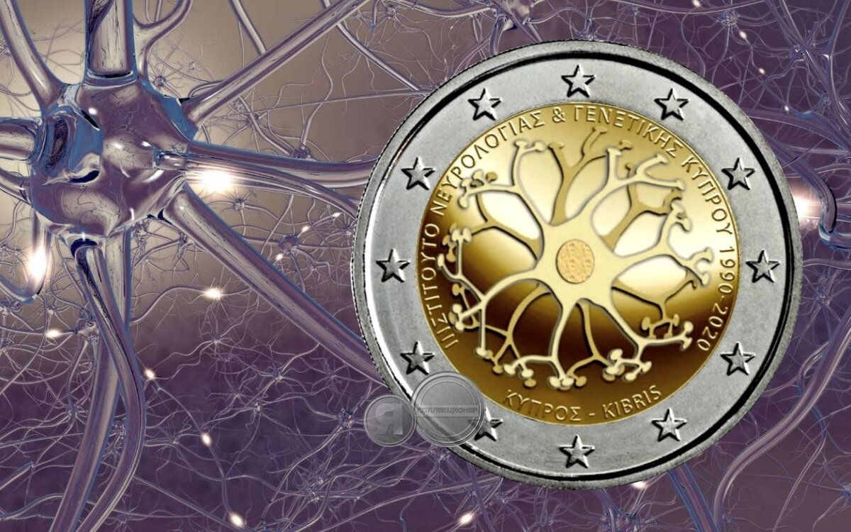 Памятная монета «Кипр 2020» номиналом 2 евро, посвященная «30-летию Кипрского института неврологии и генетики», имеет своеобразный дизайн того, что обычно изображается на монетах.
