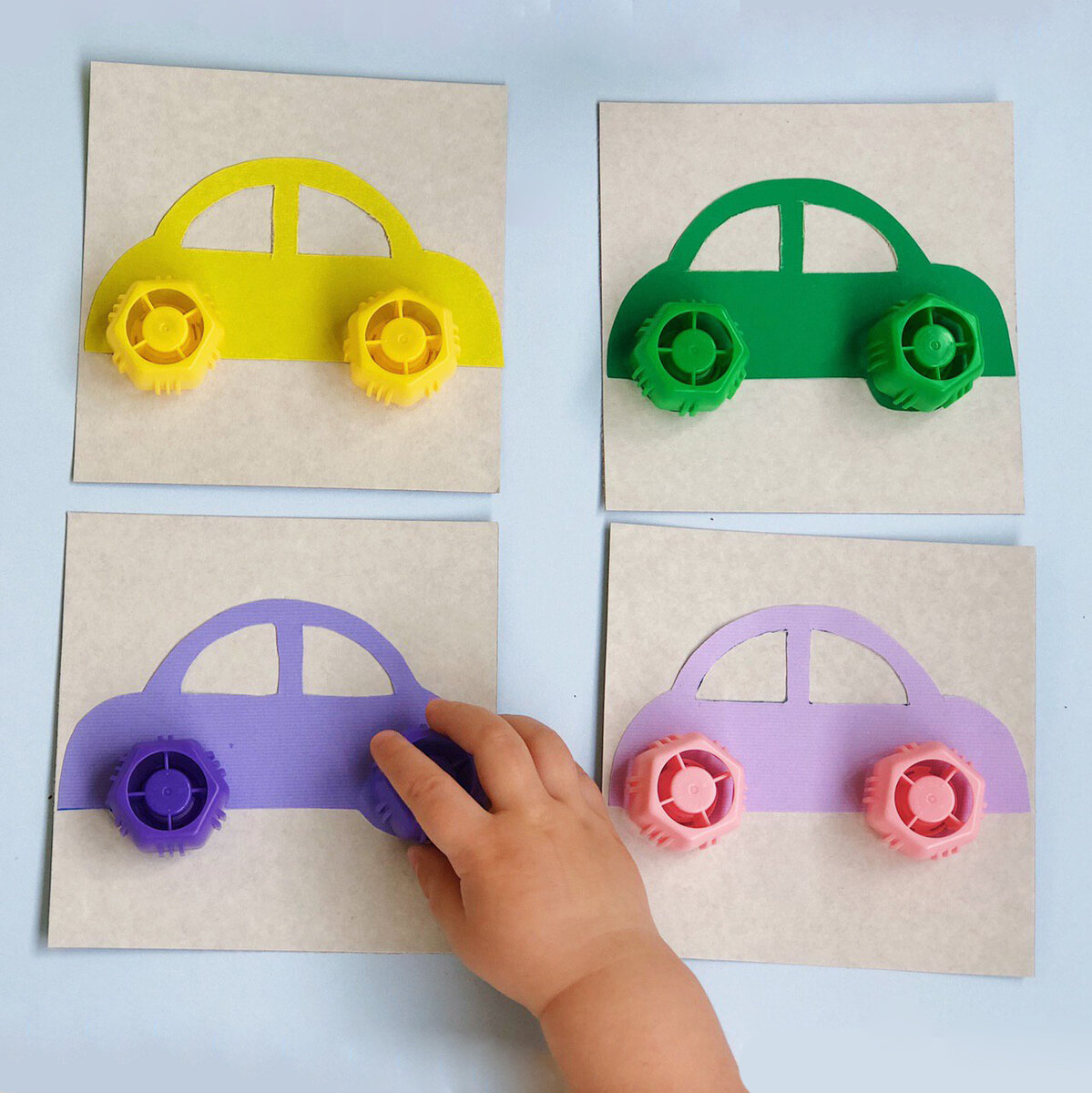 Малыш захочет возвращаться к игре снова и снова😉️️️️️️ Вам понадобится: ✂ Цветной картон ✂ Плотный картон ✂ Разноцветные Фрутокрышки ✂ Клей ✂ Ножницы ✔️Вырежьте из цветного картона машинки и цветы под цвет Фрутокрышек. ✔️Приклейте фигуры на плотный картон, так вы продлите срок службы новой развивающей игрушке. ✔️предложите малышу найти колеса для машинок или центр цветочка в цвет. Моему крохе очень понравилась игра!