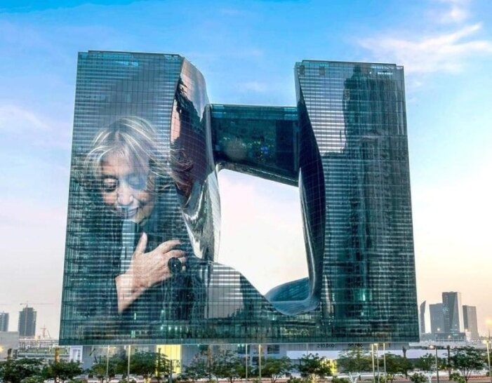 Благодаря светодиодным лампам фасад могут украшать и трогательные образы, и подсветка «дыры» здания («The Opus», Дубай). | .
