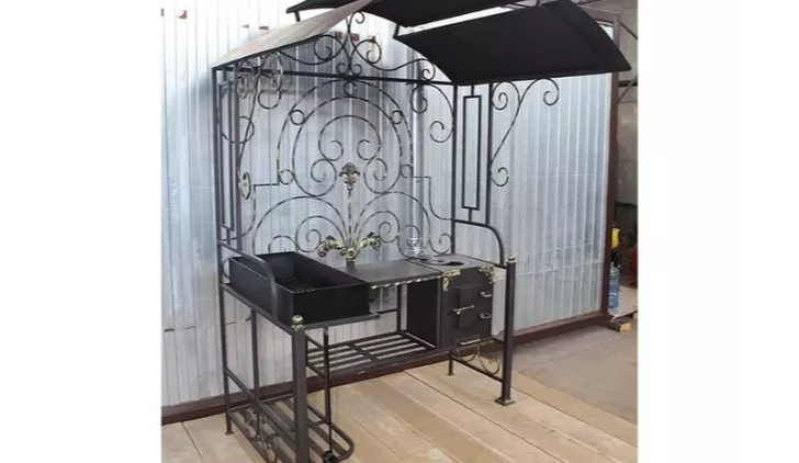 Относительно небольшие габариты конструкции, составляющие 1,5м в длину, и 1м – в ширину, позволяют разместить его практически в любой части придомовой территории или непосредственно в саду. Крыша надёжно защитит домашнего кулинара от капризов природы. Благодаря этому элементу конструкции, вы сможете комфортно готовить свои шедевры как в дождь, так и в палящий зной.