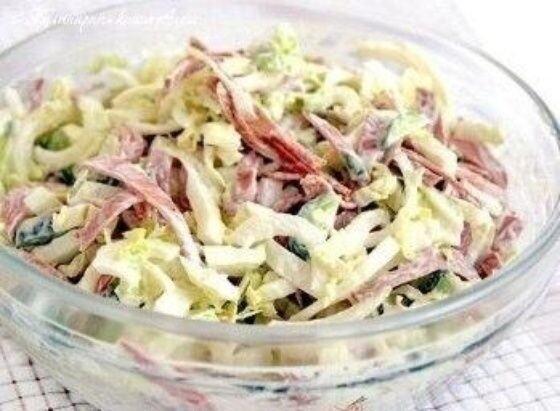 Ингредиенты: Как готовить: 1. Капусту шинкуем (у нас пекинская, с ней вкуснее) 2. Огурец режем соломкой (я люблю чтоб соломка была по-крупней) 3. Колбасу режем соломкой 4. Лук режем полукольцами 5. Добавляем майонез, соль, перец и всё перемешиваем!