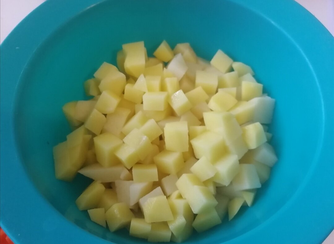 Затем порежьте картошку кубиками или брусочками, не очень крупно.