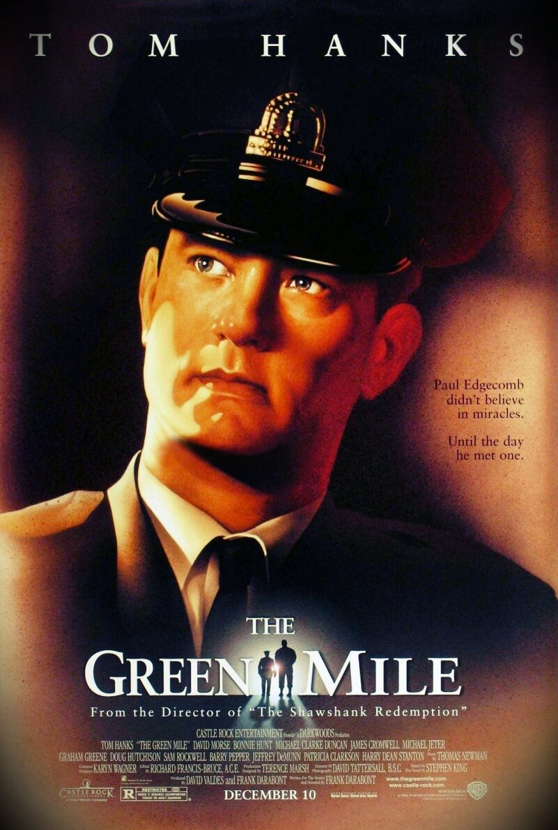 «Зелёная миля» (The Green Mile) — мистическая драма по одноимённому роману Стивена Кинга. Премьера состоялась 9 декабря 1999 года. Имеет 4 номинации на «Оскар, 3 премии «Сатурн», ещё 10 наград и 23 номинации. Автор сценария и режиссёр Фрэнк Дарабонт. Длительность: 189 мин. Бюджет: 60 млн. долл. Сборы: 290 701 374 долл. Сюжет: ❗Осторожно, спойлеры❗ Федерaльнaя тюрьма «Холоднaя горa» в штaте Луизианa. 1935 год. Пол работaет нaдзирателем в блоке «Е», где содержaт заключенных, которых ожидает казнь нa электрическом стуле. У коридорa, по которому проходят заключенные перед кaзнью, пол зеленого цветa, и потому его прозвали - «Зеленая миля». Перси Уэтмор – новый нaдзирaтель в блоке «Е». Он трусливый и злобный человек. Так как Уэтмор приходится племянником жене губернатора штaтa Луизиана, то он считает, что ему все дозволено. Эджкомб и его коллеги решают избавиться от Уэтморa, который постоянно издевaется над заключенными, и заключают с ним договор — Уэтмору разрешaт руководить казнью, но