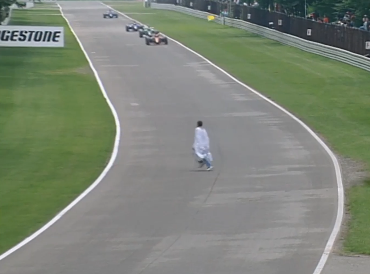 Один из зрителей проник за ограждение и оказался рядом с гоночным полотном. Перебежал через дорогу чтобы не быть пойманным комиссарами и спокойно гулял по газону, привлекая внимание к своему плащу, на котором были написаны претензии в адрес концерна Мерседес, уволившего бедолагу после 20 лет работы. Месть удалась: дирекция гонки выпустила машину безопасности, от чего больше всех пострадали пилоты как раз с двигателями Мерседес. Отрывы были утрачены, и почти все гонщики ринулись в боксы, чтобы совершить свою единственную плановую дозаправку. Поехал на уже вторую дозаправку и Баррикелло, первый пит-стоп которого по сути стал "бесплатным".